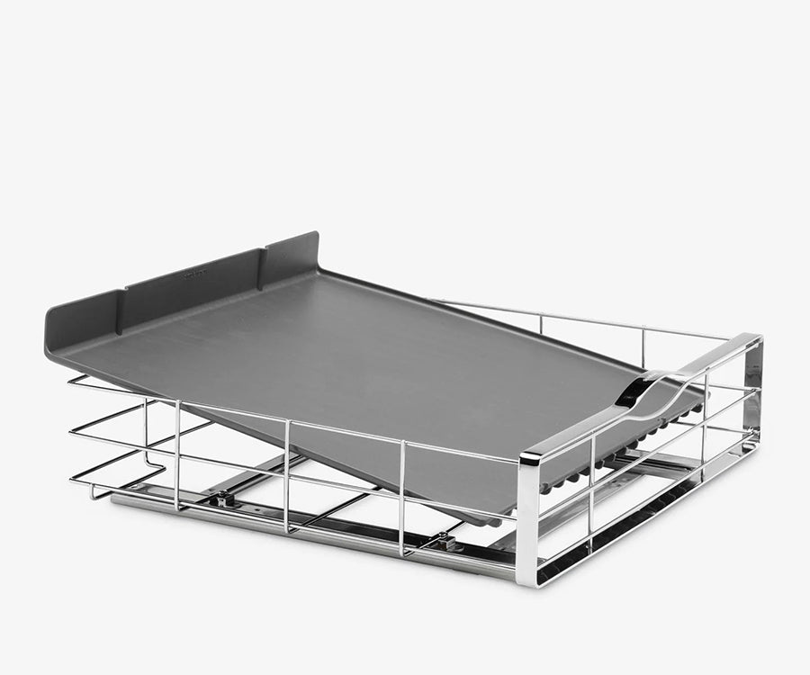 Grab the steel handle to pull the organizer out of the cabinet quickly.